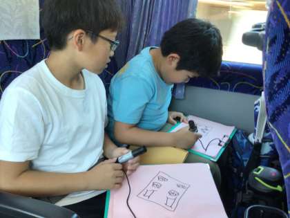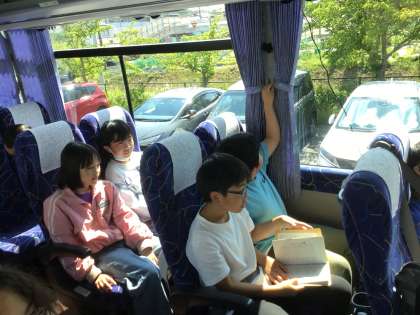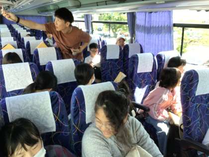 バスの中では、音楽プロジェクトのメンバーが準備してくれたバスレクを楽しんでいます。