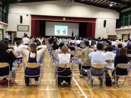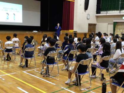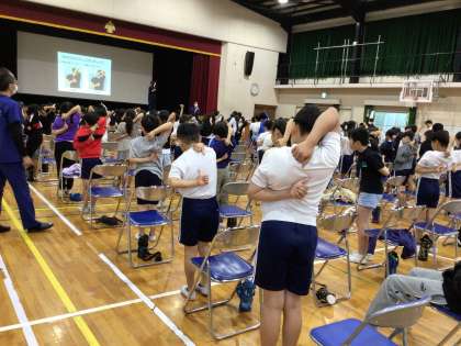 姿勢によって体に悪い影響が出ることや、よい姿勢のためには「パワー、バランス、やわらかさ」が大事だということをお話していただき、後半は、体幹を鍛える運動を保護者も一緒に行いました。