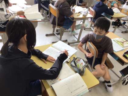 「世界でいちばんやかましい音」という物語を読んで、ヤマ場や、ヤマ場を通して登場人物がどう変化したかを話し合っていました。