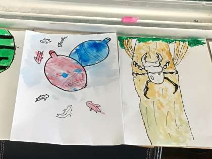6/28 4-1 図工 公開日 2024/06/28 更新日 2024/06/28 校長室から 絵手紙に挑戦しています。 学習用タブレットを使って、下絵を調べ、水彩絵の具で色を付けています。 夏にぴったりの絵手紙が、もう少しで完成です。