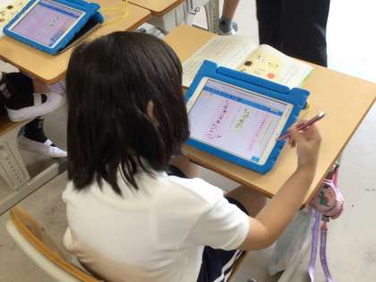 タブレット上のワークシートに書き込んでいます。