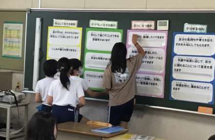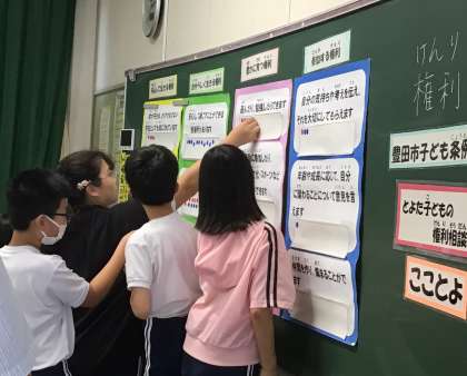 子どもたちには「安心して生きる権利」「自分らしく生きる権利」「豊かに育つ権利」「参加する権利」があり、これらの権利について具体的にお話していただきました。また、その中で、それぞれが一番大切だと思う権利と守られていると思う権利にシールを貼って示しました。