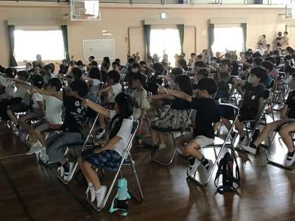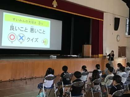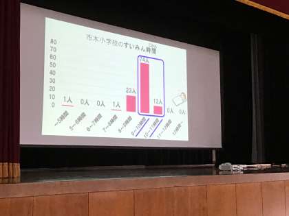 9/28 授業参観 1,2年 学校保健委員会 公開日 2024/09/28 更新日 2024/09/28 学校行事 1,2年生は、授業参観の機会を利用して、集会形式での「学校保健委員会」を行いました。 今回のテーマは「よいすいみんで元気な体と心」です。 睡眠健康指導士さんが、しっかり睡眠をとると、どんないいことがあるのかを楽しいクイズを交えながらお話してくださいました。 また、事前のアンケートから市木小の1,2年生の睡眠のいいところや、改善点を教えていただきました。