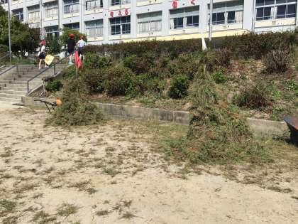 10/1 草取りウィーク 公開日 2024/10/01 更新日 2024/10/01 校長室から 今週は、スポーツフェスティバルに向けた草取りウィークです。 10月1日、3日、4日のさわやかタイムに、やまびこ班ごとに集まって草取りを実施します。 集めた草は、赤チーム、白チームに分けて集めています。 どちらもあっという間に大きな草の山ができました。