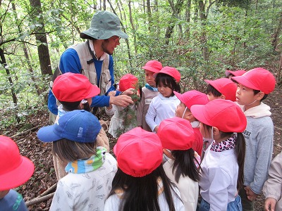10/25 1-2 トヨタの森(校外学習) 公開日 2024/10/25 更新日 2024/10/25 各学年から 気持ちのよい天候の中、今日は、1年2組がトヨタの森を訪れました。 森の中で秋見つけをしたり、坂を駆け上がったりしました。 大きな樹の下に立って、幹を揺らしてもらい、葉っぱから落ちる雫を楽しみました。 今日は、森の中でムササビも見つけました。 来週は、2年生が行く予定です。 また違った生き物が見つかりそうです。