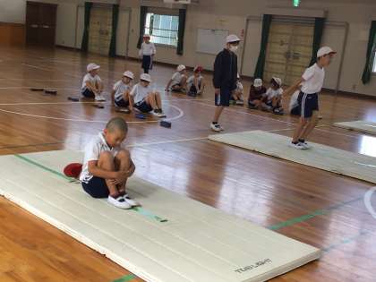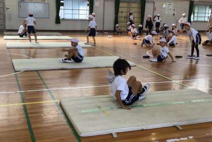 10/28 3-2 体育 公開日 2024/10/28 更新日 2024/10/28 校長室から マット運動で、技の練習中です。 前転、後転、開脚前転,開脚後転をそれぞれ練習していました。 背中を丸めて転がること、後転のときに手をうまくつくことが、なかなか難しいようです。 二つの技をつなげて発表するため、つなぎで向きを変える部分もかっこよくできるように意識して取り組んでいました。