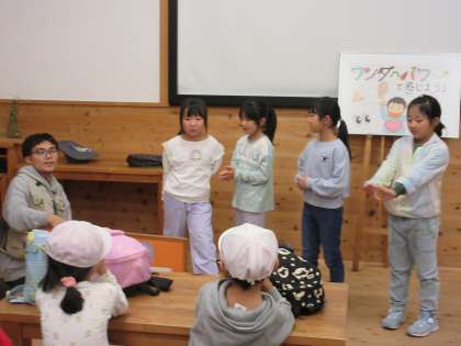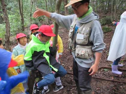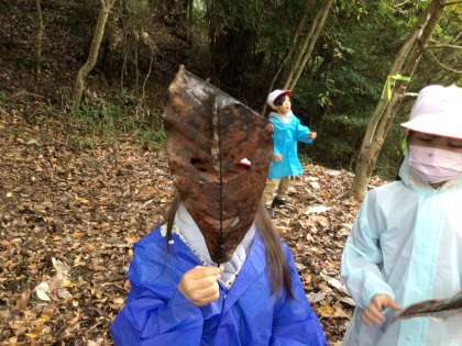 10/29 2-1 トヨタの森(校外学習) 公開日 2024/10/29 更新日 2024/10/29 各学年から 少し肌寒い中でしたが、今日は、2年1組がトヨタの森に行きました。 少し雨も降っていたので、カッパを着て、森の中を散策しました。 葉っぱをちぎってにおいをかいだり、大きなはっぱをお面にしたり、木の実当てをしたりして楽しみました。 散策の後には、森の中で発見したコトやモノを発表しました。