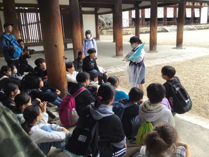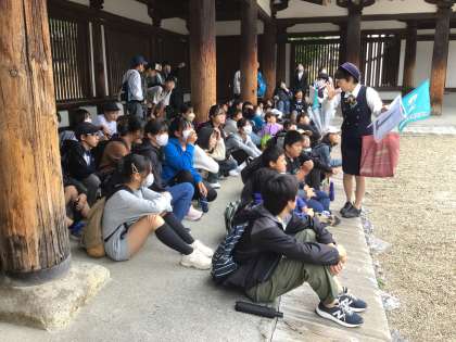 五重塔や大講堂などについてガイドさんから説明を聞いて、建物や工夫されているところの写真を撮りました。