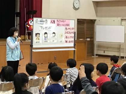 人権擁護委員のみなさんからお話を聞いたり、DVDを見たり、ダンスをしたりし、いじめについて、また相手を思いやることの大切さにについて考えました。