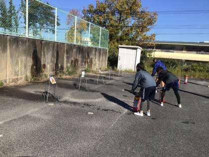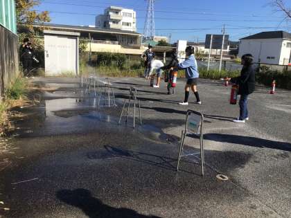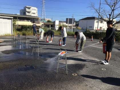 消防署の方に使い方を教えていただき、一人ずつ水消火器を使ってみました。