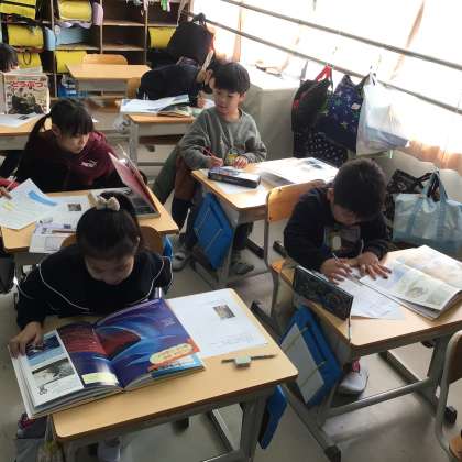知りたいことに速くたどり着くためには、「さくいん」や「もくじ」を使うとよいことを教えてもらい、早速調べていました。