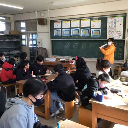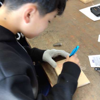 1/22 6-1図工 公開日 2025/01/22 更新日 2025/01/22 校長室から 6年生は、卒業制作でグランドボックス作りに取り組んでいます。 天板のところに、思い出の言葉や図を彫ります。 今日は、講師の方に来ていただき、彫刻刀の使い方を教えていただきました。 大きな彫刻刀の模型を使って、手の添え方や刃の向きを具体的に教えていただいたので、わかりやすかったようです。 どの子も手元をしっかりと見ながら、慎重に作業をしていました。