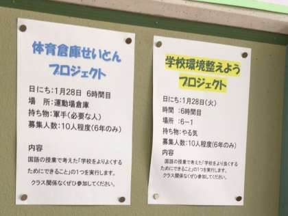 1/28 5・6年生 やまびこプロジェクト活動 公開日 2025/01/28 更新日 2025/01/28 校長室から 今日は、「図書館フェスティバル」「体育倉庫整とん」「屋外整備」「学校環境整えよう」「つくえピカピカ」の5つのプロジェクト活動を行いました。 「体育館整とん」と「学校環境整えよう」は、6年生の国語「学校をよりよくするためにできること」の学習で考え、提案されたものです。 学校のためにできることを考え、自分たちから実践に移してくれており、頼もしい限りです。