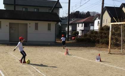 コーンをめがけてボールを蹴り、当たると1点獲得です。