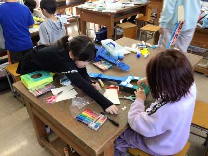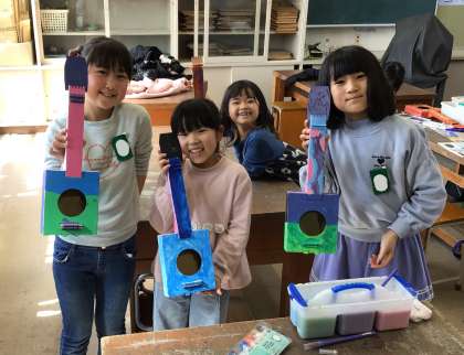箱を組み立ててできた楽器に、絵を描いたり色を着けたりして、自分だけの楽器を作っています。