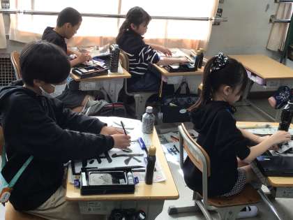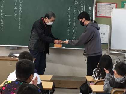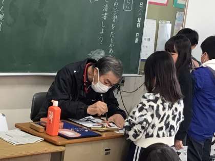 3/14 書道ボランティア 公開日 2025/03/14 更新日 2025/03/14 校長室から 書道ボランティアとして指導に来てくださる先生が、今日の授業で最後となりました。 何年も前から、主に3年生の書写の授業で指導をしてくださり、たくさんの市木っ子が、書き上げた作品を添削してもらうなど、お世話になってきました。 今日は授業の終わりに、3年生から6年生、それぞれ代表者が、お礼のメッセージを渡しました。 長い間、市木っ子を温かく指導してくださり、ありがとうございました。