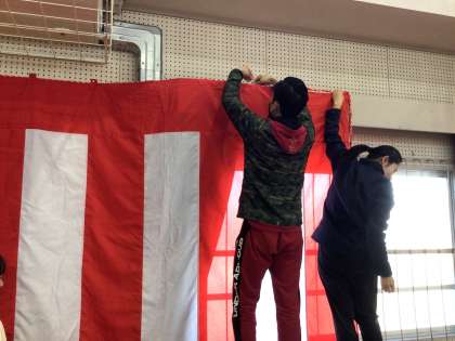 入学式に向け、教職員で紅白幕の準備を行いました。