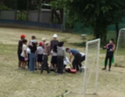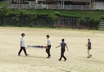 「休み時間に、運動場で遊んでいるときに熱中症のような症状になって倒れた」という想定での実施です。教職員だけでなく、周りにいる子どもたちもどう行動したらよいかを訓練する機会となっています。運動場で倒れた人への対応がスムーズにできるように、遊んでいた子どもたちも、やまびこ広場の日陰に移動して静かに待つことができました。