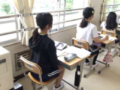 タブレットを使う授業などの際、首に姿勢ペンダントをかけ、よい姿勢の目安となるようにしています。座骨を立てて座って、背中をぴんと伸ばし、床に足の裏をぺたんとつけて座るのが目標です。1時間ずっとは難しくても、授業の途中で姿勢を意識するように声掛けをしています。どの学年の子どもたちも、自分の姿勢を気にかけながら過ごしています。