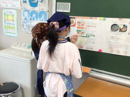 ニンジン、ピーマン、玉ねぎなどを使った野菜炒めです。野菜を洗って切る作業を始めているところでした。「玉ねぎは、皮をむいてから洗う?洗ってから皮をむく?」「ニンジンの切り方、どうだったかな」と、疑問点が出ると、前に掲示してある手順を確認していました。苦戦していたのは、ニンジンの短冊切りです。硬いニンジンを3mm幅で切ろうと、包丁を使って慎重に作業していました。
