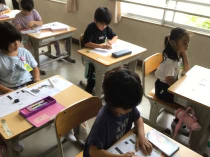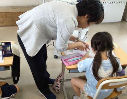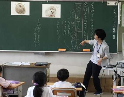 1年生は、国語で「どうやって みをまもるのかな」という説明文を学習しています。その絵本の中に載っているほかの生き物のお話を取り上げ、本を使ってどんなふうに調べたらよいか、まとめたらよいかを勉強しました。今日の授業では、ハリネズミを取り上げ、ハリネズミについて書かれた文章から、身の守り方について書いてあるところを探して、プリントに記入していました。子どもたちは、プリントにハリネズミの絵も描いて、楽しそうに授業を受けていました。本から知りたい情報をどうやって見つけるかが分かったようです。