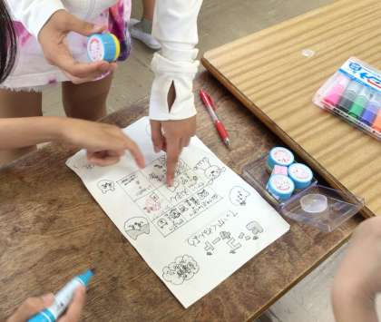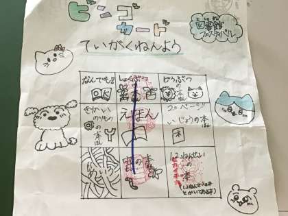 雨や暑さでさわやかタイムやお昼の休み時間に外に遊びに行けないときに合わせて、うまく企画してくれています。今回は「図書館ビンゴ」で、ビンゴカードに書いてある分類の本を借りて読むと、スタンプを押してもらえます。スタンプがそろうと、ぬり絵やしおりのプレゼントがありました。ビンゴした子たちは、うれしそうに手作りのプレゼントを選んでいました。