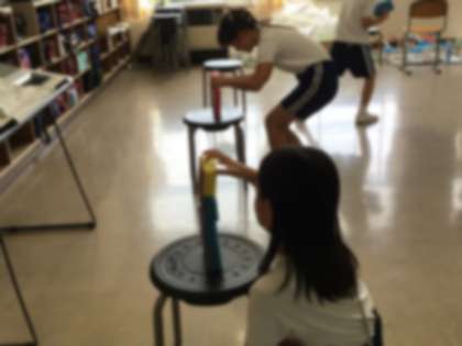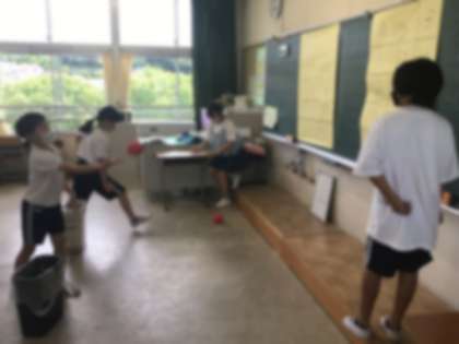 定番の宝探しや何でもバスケットはもちろん、ボールを的に当てて点数を競うゲームや、スポンジを積み上げるゲームなど、新たな遊びも考えられていました。6年生が遊びをいろいろと工夫してくれたおかげで、やまびこ班のみんなで楽しむことができました。