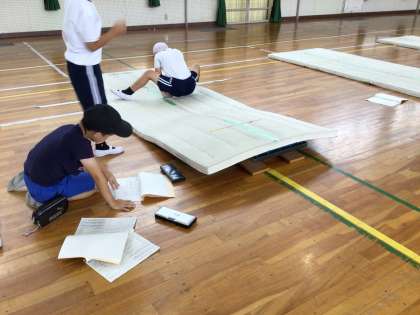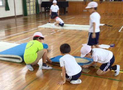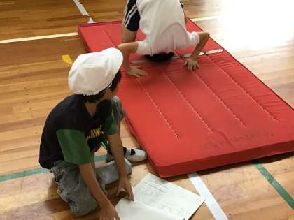 7/16 3-2 体育 公開日 2025/07/16 更新日 2025/07/16 校長室から 体育でマット運動に取り組んでいます。 前転、後転だけでなく、開脚前転や開脚後転にも挑戦していました。マット運動ノートを見ながら、ペアの子の動きを観察し、手の付き方や体の丸め方などのアドバイスをしていました。少し傾斜がつくと回りやすくなると知り、マットの下にロイター版を置いて坂を作ろうと、協力しながら練習に取り組んでいました。