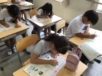大文字と小文字の形や大きさの違いに気を付けたり、どの位置から書くのかを注意深く確かめたりして、丁寧に練習していました。暑い中ですが、集中して取り組んでいます。