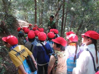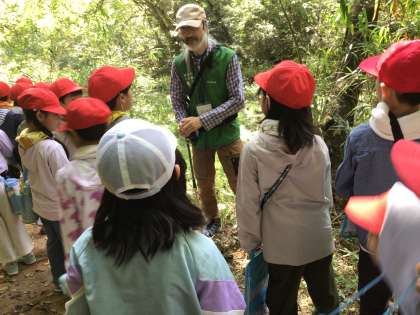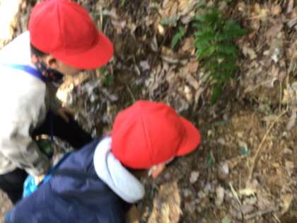 観察の森では、レンジャーさんといっしょに森を散策しました。「いきものビンゴ」の用紙を手に、森の中で「こんちゅう」「カラフル」「いろいろなかたちのはっぱ」など、ビンゴで指示された内容を探しながら歩きました。「もちみたいなキノコがあった」「草木のにおいなんてかいだことがなかったけど、変なにおいだなと思った」「森っていろんなことがあって楽しい」など、子どもたちには様々な気づきがあったようです。