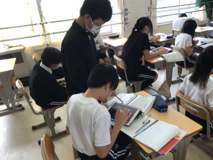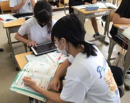 どのようにすると平均値が出せるのかを確認し、それぞれのチームの記録を計算していました。学習用タブレットの電卓機能を使い、数値を読み上げる人と電卓に入力する人に分かれ、協力しながら進めていました。