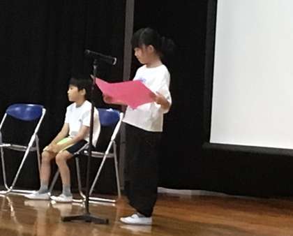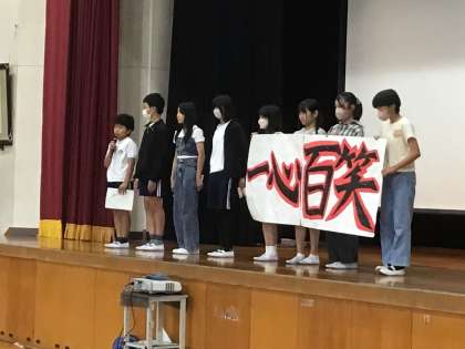 会の初めに、1年生、3年生の代表児童がスピーチをしました。それぞれ、「姿勢よく話を聞くことを頑張った。スポフェスの旗体操を一生懸命練習している」「学級委員として、クラスへの声かけを頑張って、まとまってきてうれしい」と、話をしてくれました。二人の堂々とした発表に、会場の子どもたちから、自然と拍手がおこっていました。