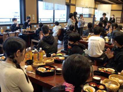 10/31 6年生 修学旅行3 公開日 2025/10/31 更新日 2025/10/31 学校行事 昼食 班で揃って昼食です。天ぷらや煮物、湯葉の入ったお吸い物など、おいしくいただきました。 バームクーヘンのデザートもついていて喜んでいました。