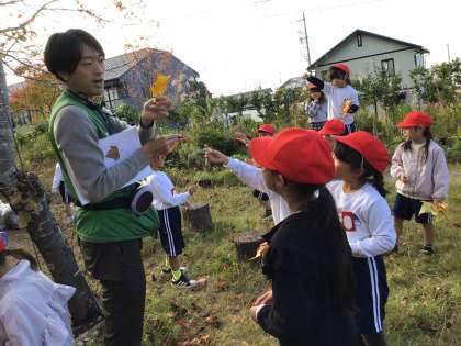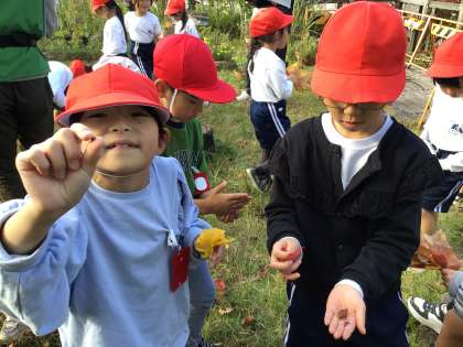 市木小のやまびこ広場と憩いの場で、落ちている葉っぱや木の実をたくさん拾い集めました。大きい葉っぱや顔みたいな形の葉っぱ、ドングリやきれいな色の木の実を拾って、子どもたちは大喜びでした。集めた葉っぱや実をスタッフさんに見せては、植物の名前を教えてもらい、うれしそうにしていました。