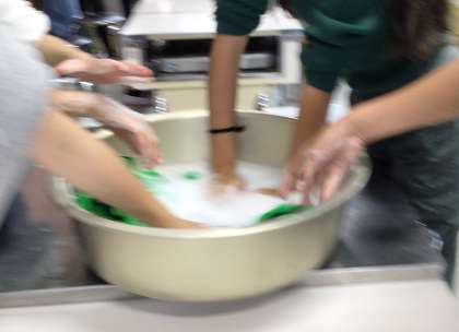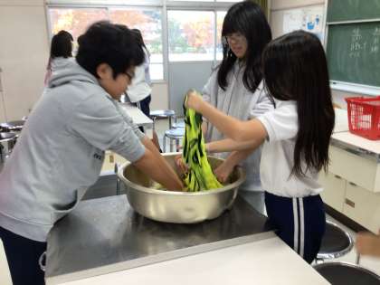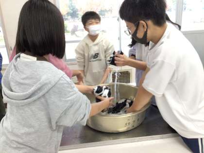 11/18 6-1 家庭科 公開日 2025/11/18 更新日 2025/11/18 校長室から 6年生は、洗濯の学習をしています。 クラブ活動やスポフェスで使用したビブスを洗濯しました。水や洗剤の量を計り、汚れや汗がつきやすい場所はどこかを考えて、首周りのところを特に念入りにもみ洗いしていました。今回は、たらいの中での洗濯のため、水が周りに飛び散るアクシデントもありましたが、グループで協力しながら取り組んでいました。