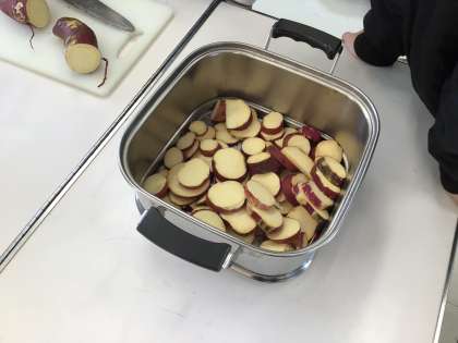 先日、野菜王国で収穫したさつまいもを6年生が蒸かしてくれました。
