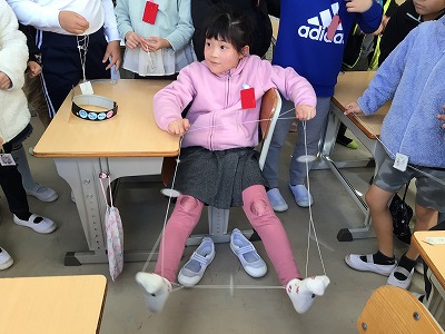 子どもたちは、普通に両手で糸を引いて回すだけでなく、どんどん新しい技にチャレンジしています。