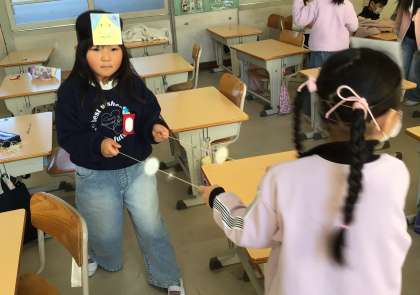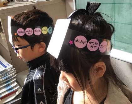 「「かめはめは」「エレベーター」「れっしゃ」「びゅんびゅんつなひき」「あしビュンつなひき」「2こわざ」「3こわざ」などなど。教室に見に行くたびに、新しい技が生まれています。技ができると、頭に付けたお面にシールを貼ってもらえすそうです。教室をのぞくと、できた技を誇らしげに見せてくれます。現在の最高は4つのコマを一度に回す技だとか。まだまだ新しい技が生まれそうです。