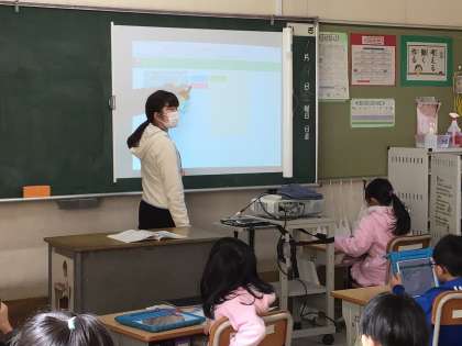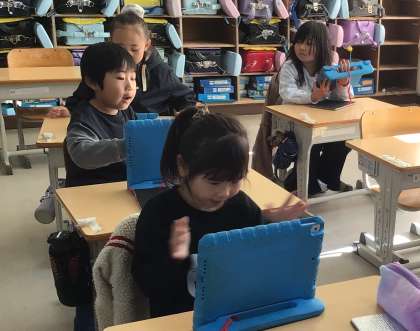 1年生の教室でも、学習用タブレットを使った学習を行っています。