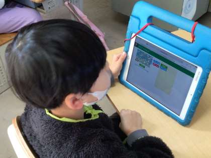 算数の授業では、プログラミングの学習をしいていました。教科書の二次元コードを読み取り、そこに登場するロボットを動かします。「うえにすすむ」「みぎにすすむ」の命令を組み合わせて、目的のところまでたどり着けるようにしていました。スタートボタンを押してロボットが動き出して目的の場所まで進むと、「やったー」「できた」という歓声が上がっていました。