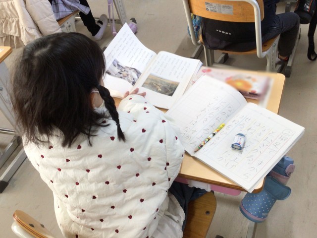 1年生は、国語の説明的文章「こどもをまもる どうぶつたち」で、いろいろな生き物の知恵を読み取る学習をしています。今日は、文章に登場するコチドリのちえを見つける学習をしていました。コチドリの親子の映像を食い入るように見て、より関心も高まったようです。見つけた知恵は、ノートにしっかりと書き出していました。ノートにも、しっかりとした筆圧で文字が書けるようになってきています。