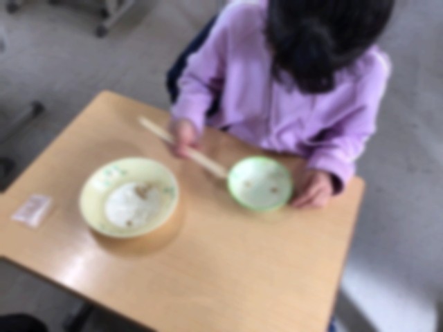 栄養教諭の先生に来ていただき、「おはし名人になろう」の学習をしました。授業の初めに食事するときに、どんな道具をどのように使っているかを考えました。子どもたちは、給食の時間を思い返しながら「スプーンですくったよ」「フォークで肉をさした」などと発表していました。そのあとには、いろいろなはしのもち方のイラストを見て、どんな持ち方がよいかを考えました。実際にはしを持って自分の使い方を確認したり、動かす練習をしたりもしました。最後には、はしで大豆をつまんで移動させるゲームもしました。今回の学習で、はしを上手く使えると、食べ物を落とさずきれいに食べられることが分かったようです。