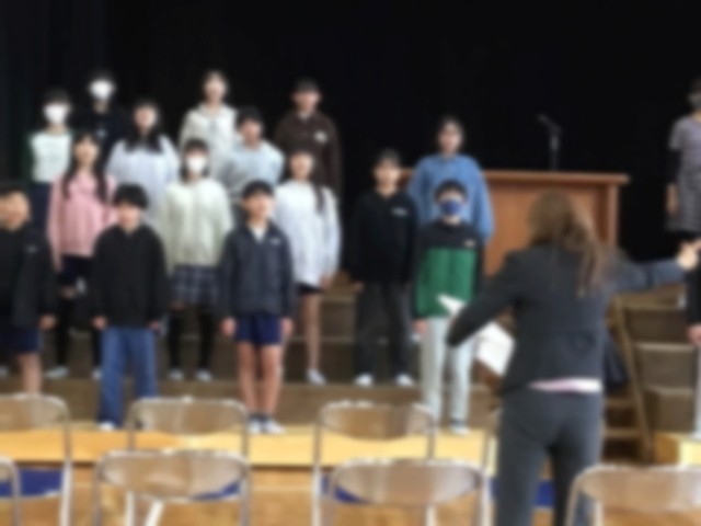 体育館で、卒業の歌「絆」の練習を行いました。体育館での声の響きを確かめながら、音をたっぷりと伸ばすこと、明るい声を意識することなどを教えていただき、練習をしました。講師の先生からは、表情が柔らくなって明るい声になってきたと、ほめていただきました。