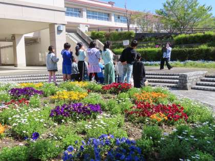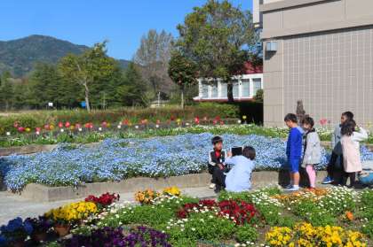 1限目に、3年2組が円型花壇で花を背景に撮影をしていました。