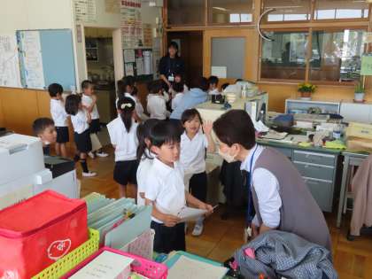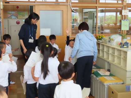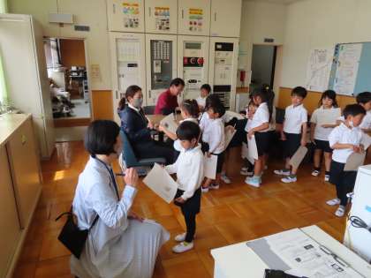 4/14 先生への自己紹介 公開日 2023/04/14 更新日 2023/04/14 お知らせ 1年生が自己紹介カードを作って、先生に自己紹介をしています。カードに好きな物の絵を描いて自分の名前と好きな物を伝えて、サインをもらっていました。