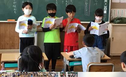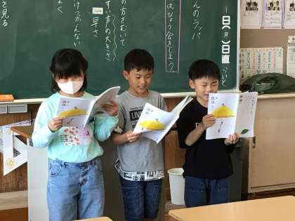 「すいせんのラッパ」の音読発表会をしました。聞いている人に場面の様子が伝わるように工夫して音読することができました。