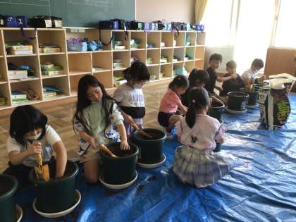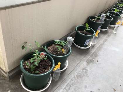 夏野菜をポットに植え,水やりをして育てています。子どもたちは「少しだけ葉が大きくなっていたよ」と毎日よく観察しています。