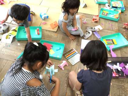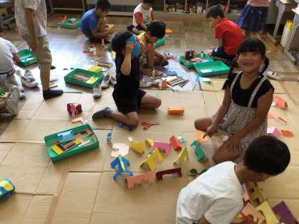 「動物がいたら楽しそう」、「公園作ろう」など、友達とお話ししながら夢中で町を作りました。