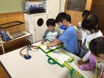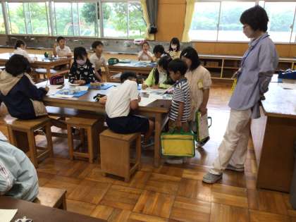 1年生普段入らない教室を紹介してもらったり、ミッションに取り組んだりして学校探検を楽しみました。
