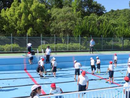 午後、6年生がプールの掃除をしました。手際よく落ち葉を取り除いて、床や壁や手すりの汚れを落としました。
